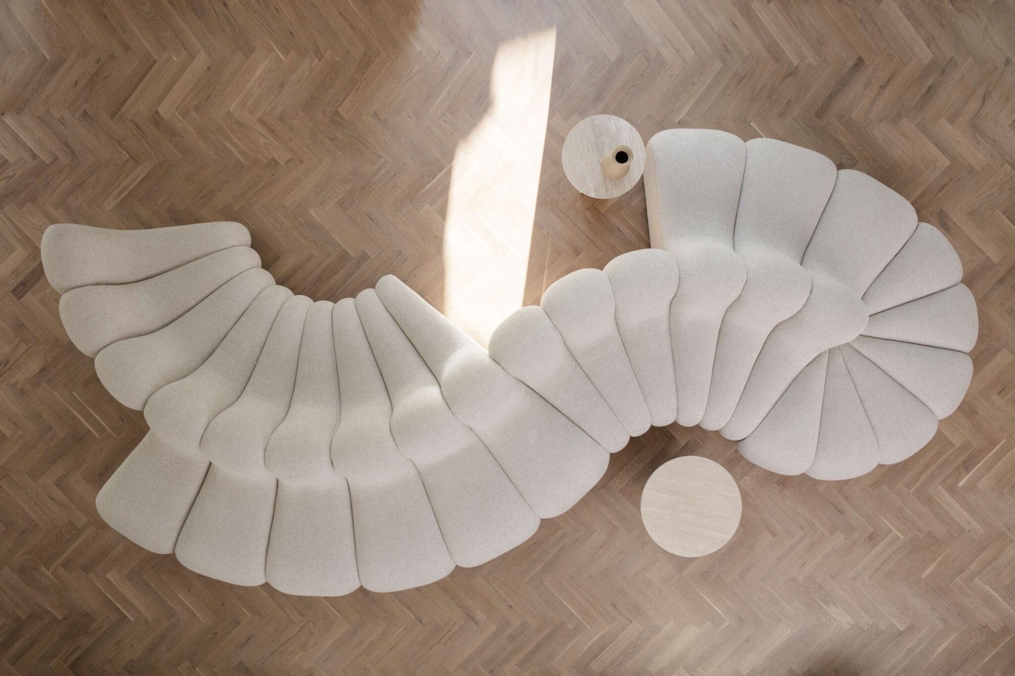 ”Imagine its endless curvature in a restaurant, forming subtle arcs to nestle in a dining table. Or a grand hotel lobby where the lounge version gracefully winds through the space.”