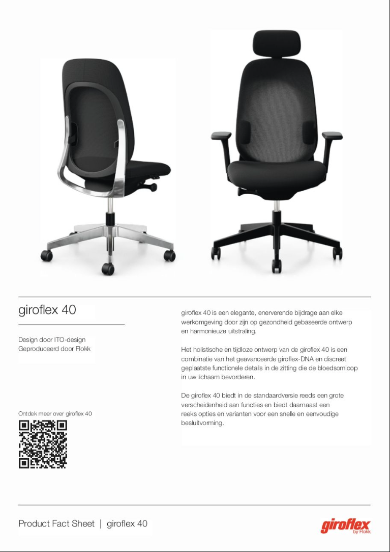 De elegante en activerende Giroflex 40 levert een energieke en ergonomische bijdrage aan iedere gebruiker in iedere werkomgeving. Het ontwerp is van ITO-Design, met lijnen die het kenmerkende Giroflex synchroonmechanisme & de dual-zone zitfilosofie integreren. Giroflex 40 legt de nadruk op een intuïtieve en toegankelijke benadering van de stoel.