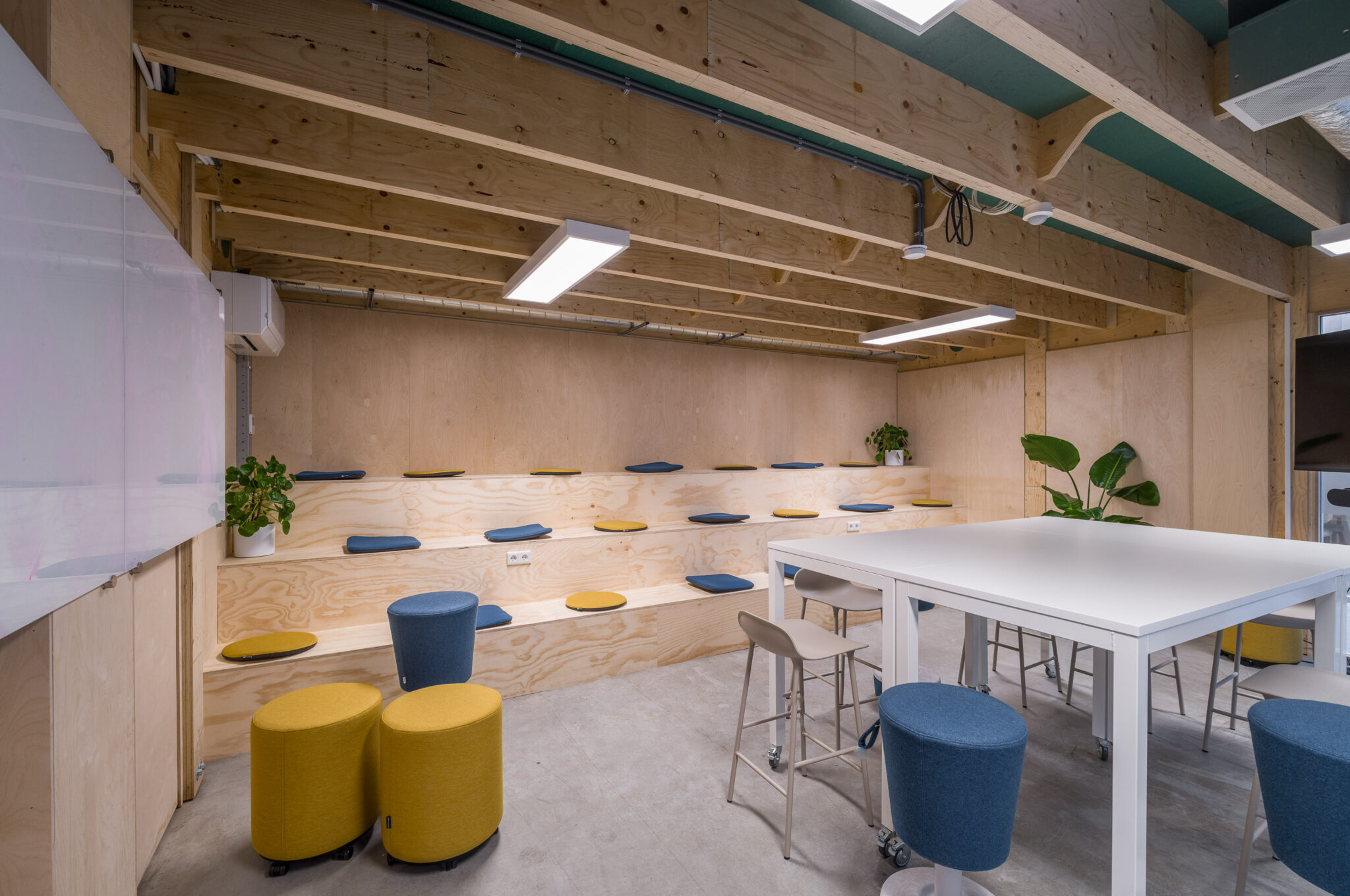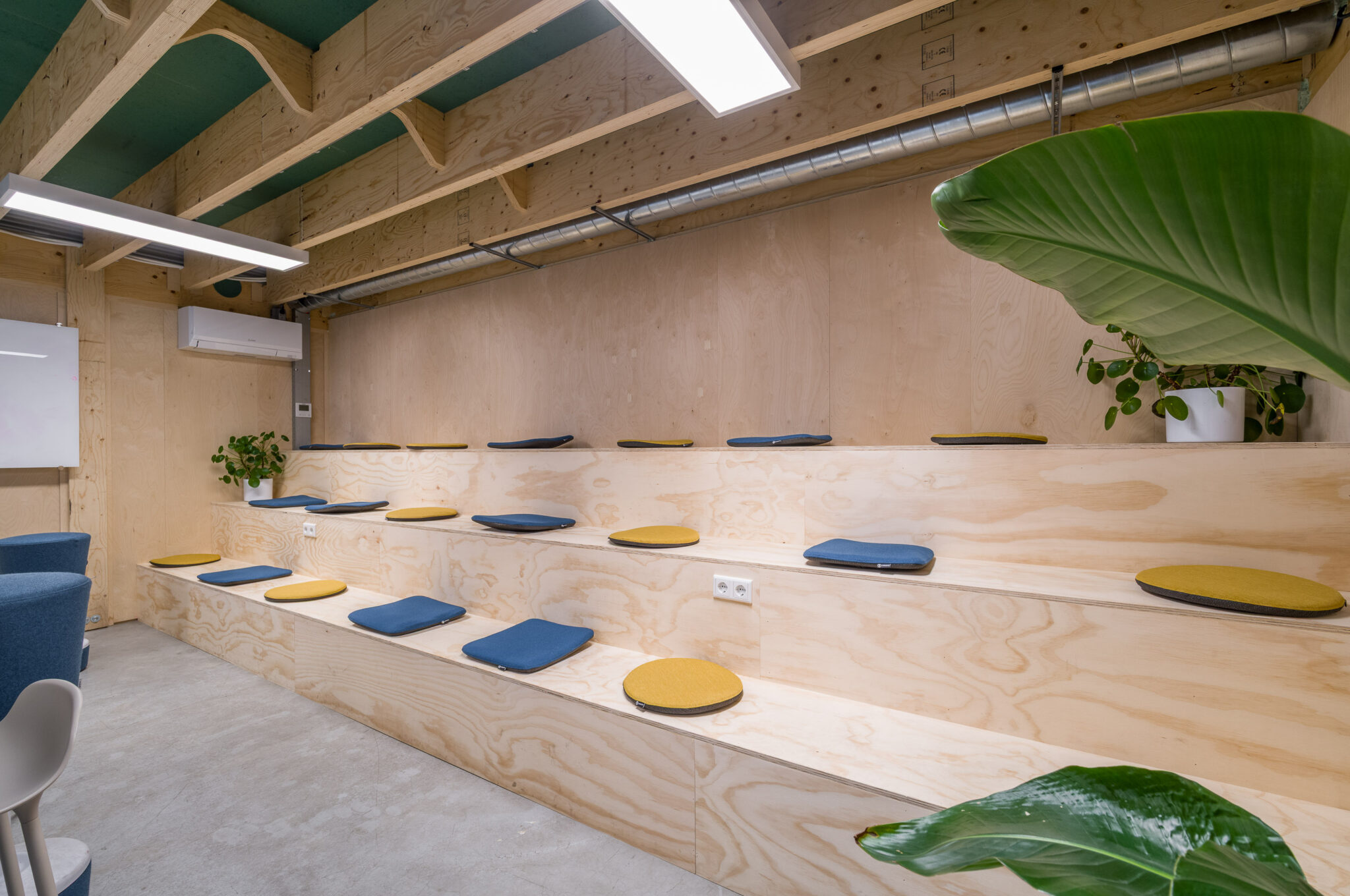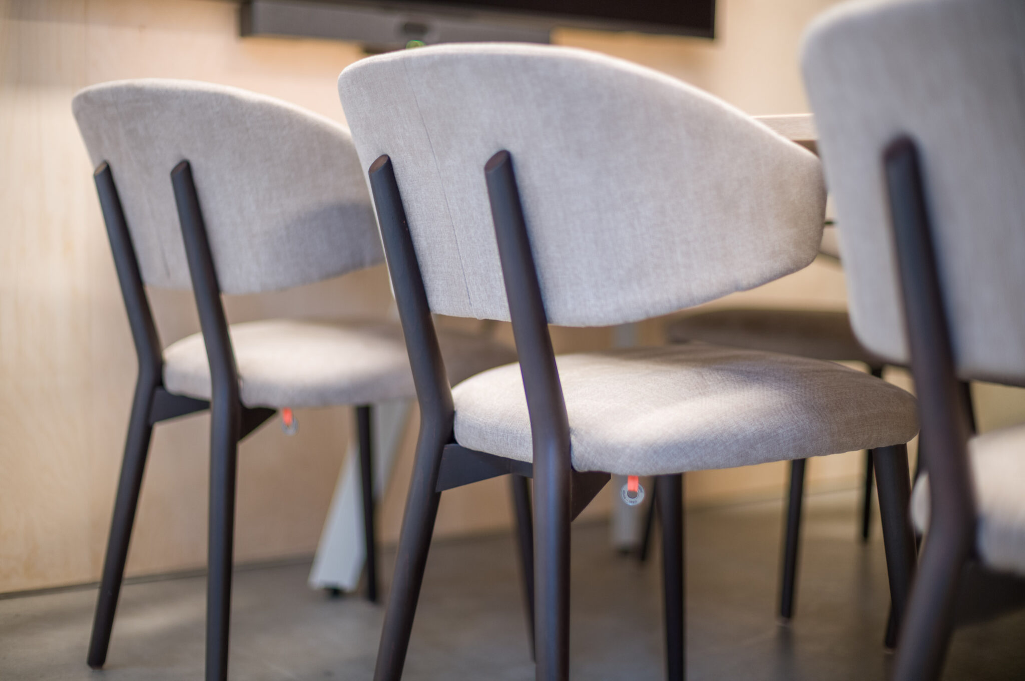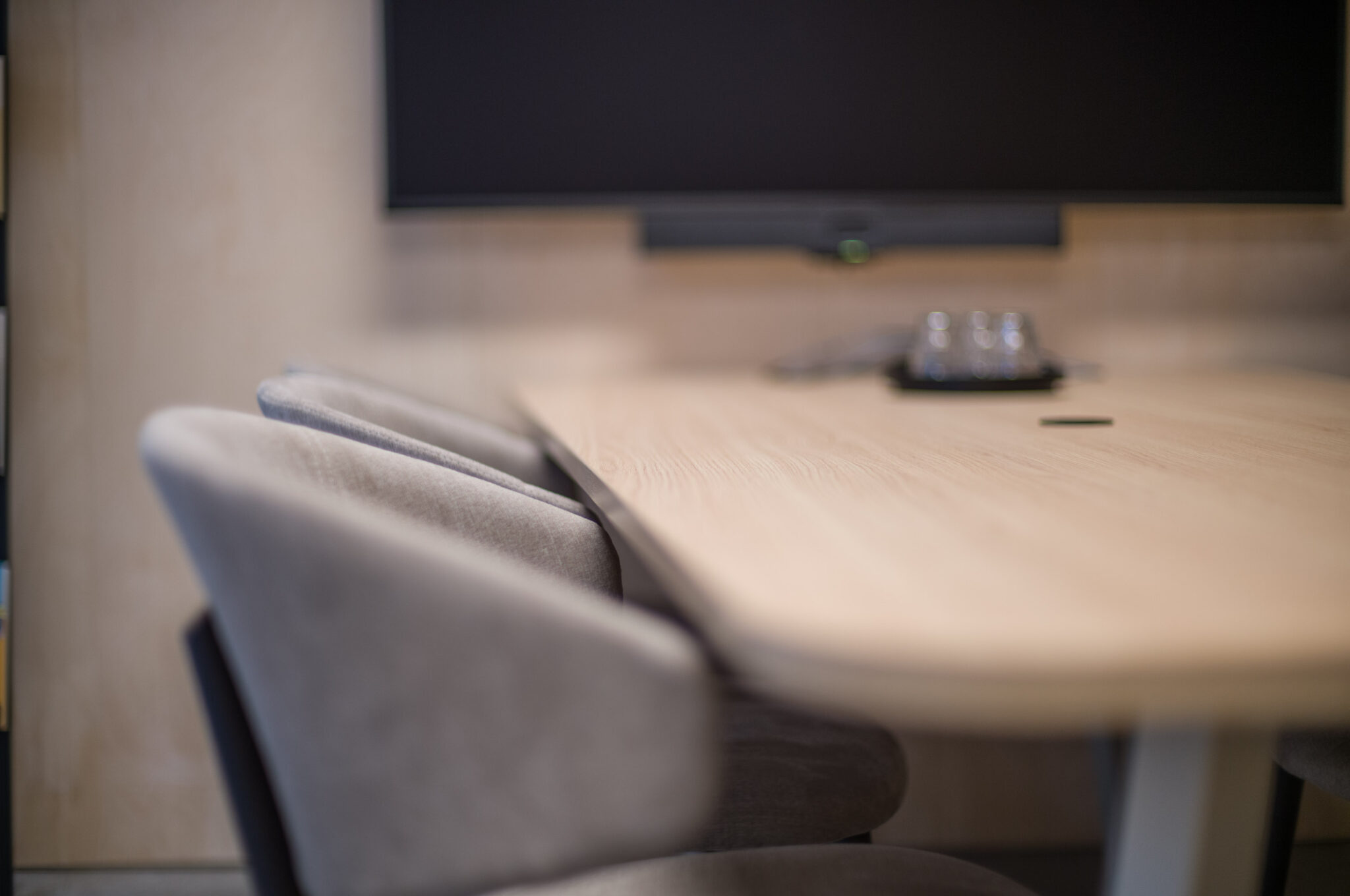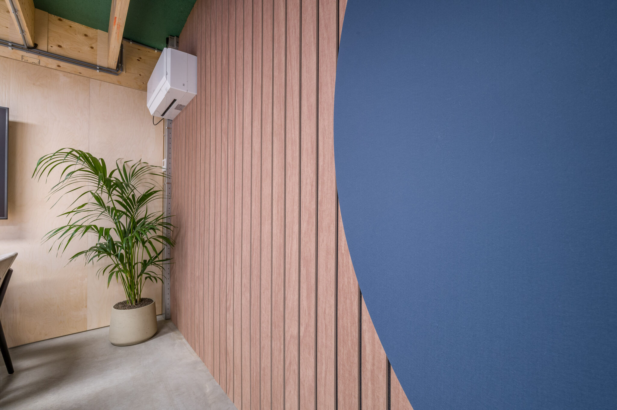 Naast het meubilair hebben wij ook de wanden voorzien van akoestische PET-vilt houtstroken, gecombineerd met de rondingen van hun huisstijl & logo.