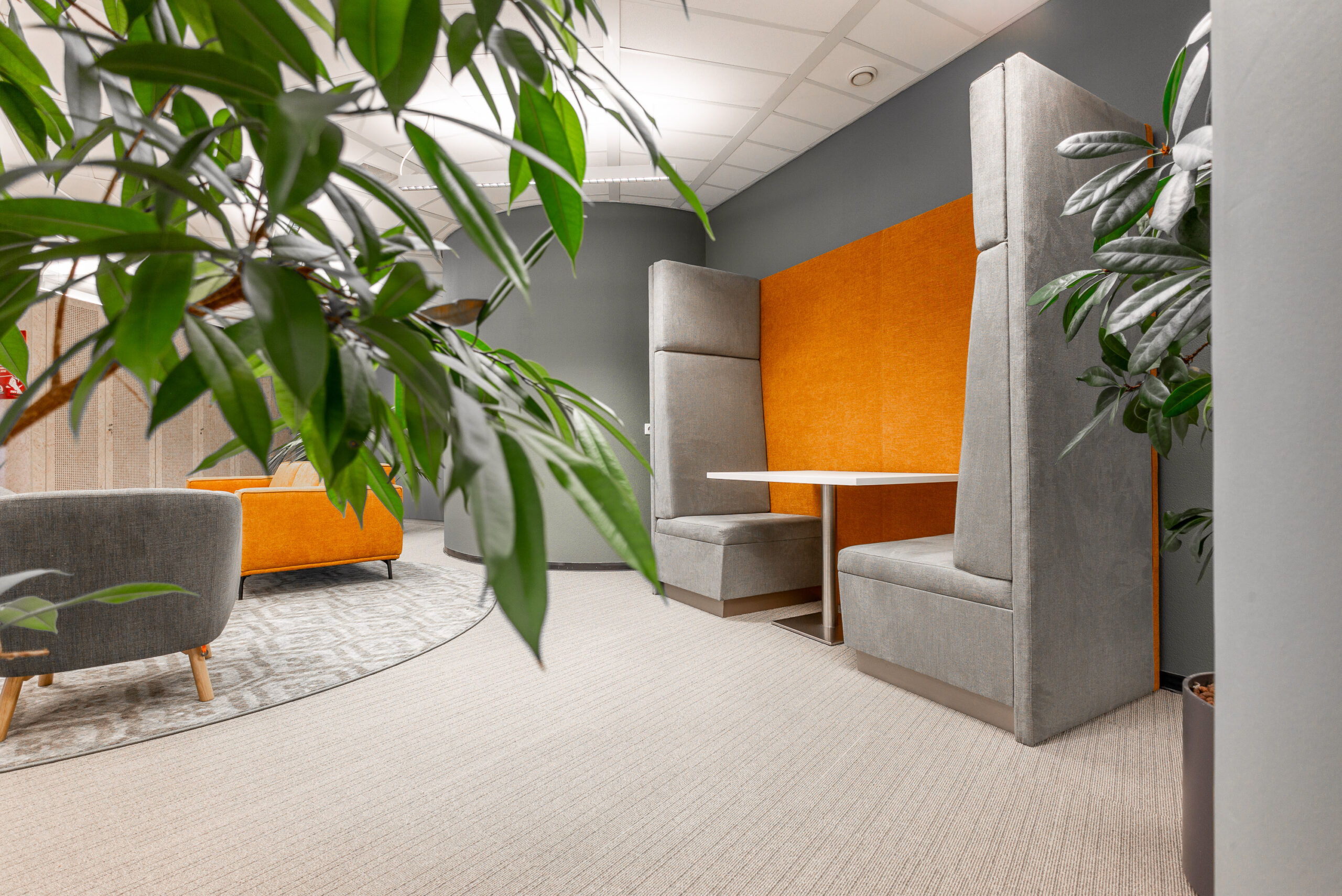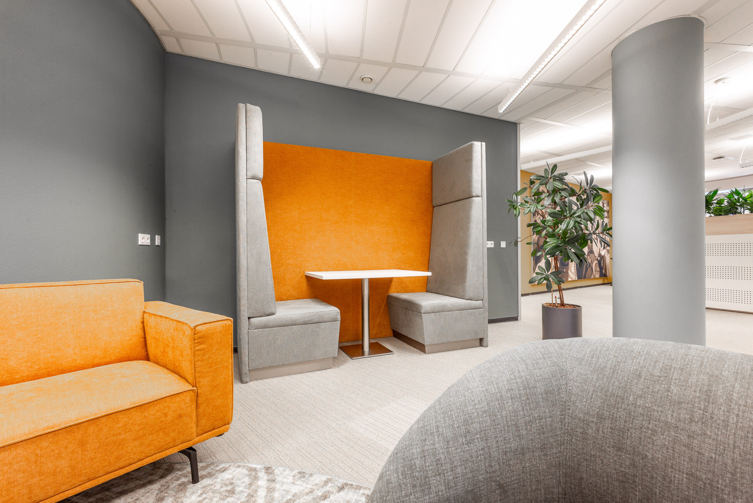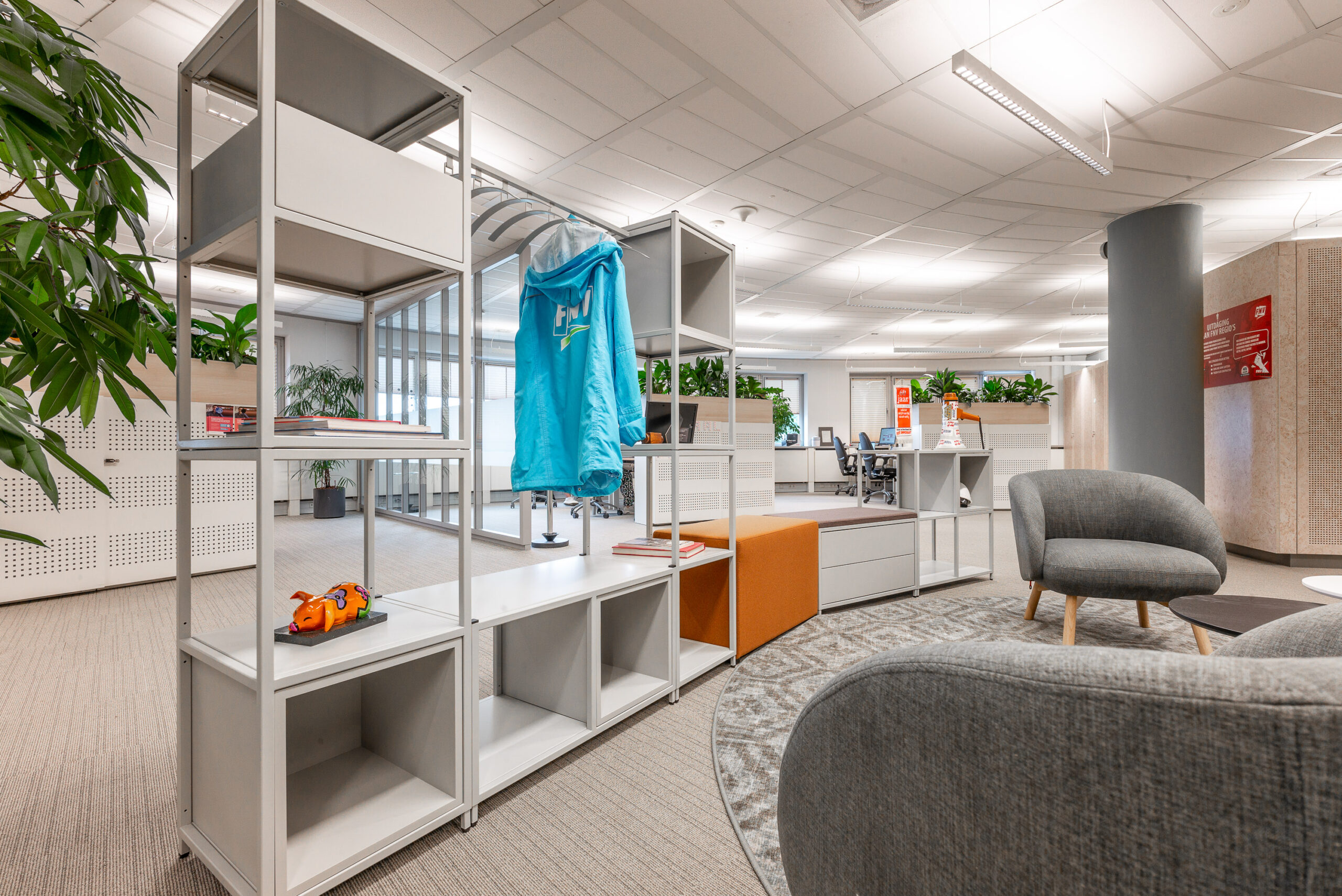 Onlangs heeft het kantoor van FNV in Rotterdam een mooie upgrade gekregen. Bestaand meubilair is intern verhuisd of opnieuw gestoffeerd en op die manier in een vernieuwde omgeving weer voorzien van een 2e leven. Verder zijn er meerdere loungeplekken gecreëerd, verschillende afscheidingen t.o.v. het loopgedeelte voorzien en wandbekleding in verschillende varianten toegebracht zoals bijvoorbeeld prachtige schilderijen van mos.